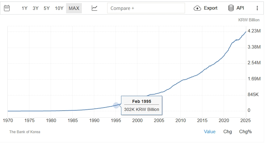 한국의 M2는 1995년 300K에서 2025년 4.2M로 대충 14배 증가했음. 일본은? 일본의 M2는 1995년 530K에서 2025년 1.2M으로 대충 2배 증가했음. 통화량 증가가 어마어마했던 한국은 부동산 가격이 올랐고, 통화량 증가 얼마 없던...